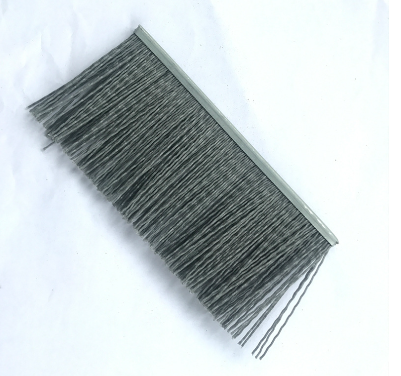 磨料絲條刷:采用鋼帶夾住磨料絲,中間用鐵絲壓住固定。刷毛緊固,不脫毛,鋼帶的厚度最小達2.5mm*2.5mm,最大14mm*14mm,單根長度不限。毛長按需定制。